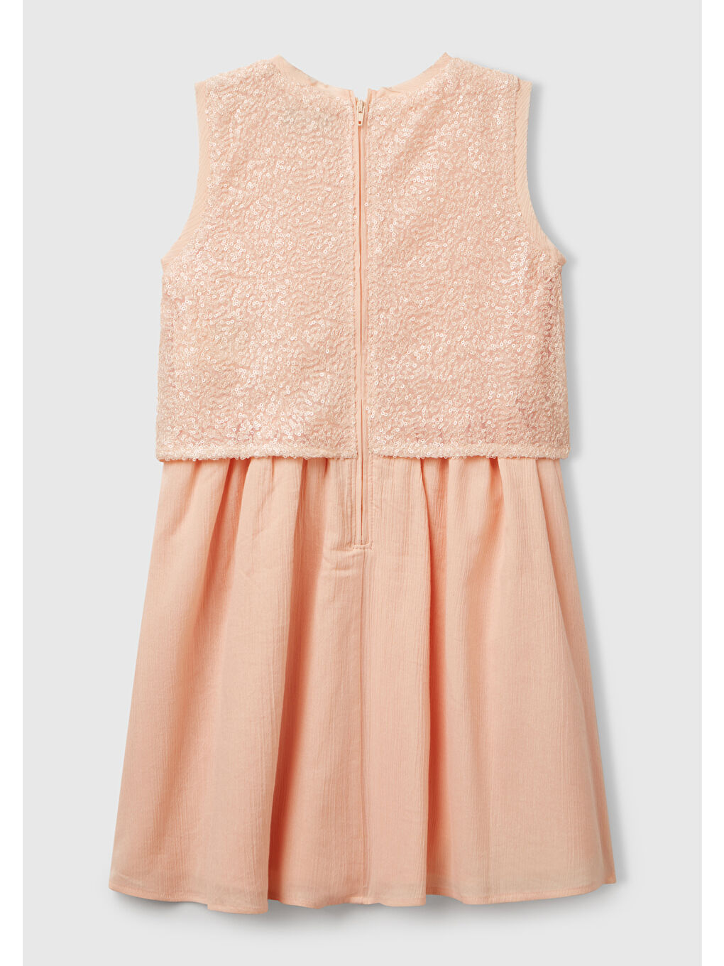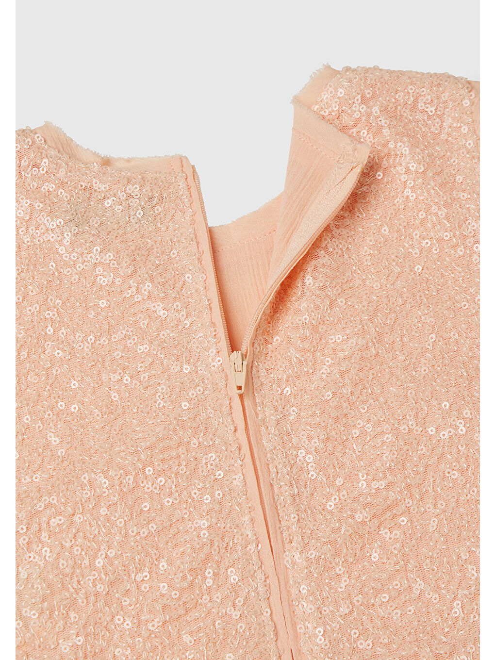 لباس آستین دار دامن توری چین دار پارچه ای پولک دار صورتی دخترانه بژ